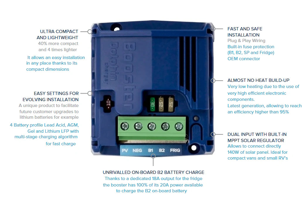 The Dolphin charger/booster is the perfect solution for those who want more freedom, autonomy, and reliability in their campervan, Motorhome, or service vehicle.