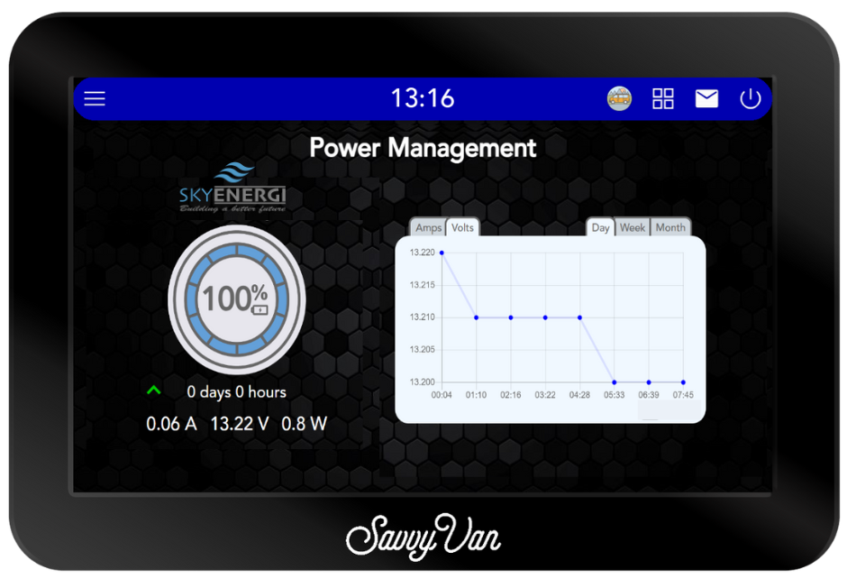 And for added peace of mind, built into SavvyVan3 is battery protection options that automatically turns off your switches or cut off the main power if your battery runs too low. With our control panel, you can rest easy knowing your battery is in good hands.  Skyenergi batteries are fully intergrated to Savvy Van control system via bluetooth (Core and Elite range), so no need for a battery shunt