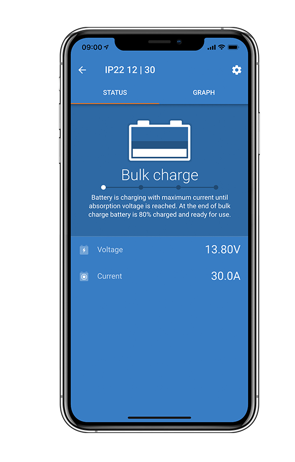 Up to 94% efficiency, the Blue Smart IP22 Charger 24/16 (1) generates up to four times less heat when compared to the industry standard. One the battery is fully charged, power consumption reduces to Watt which is five to ten times better than the industry standard.
