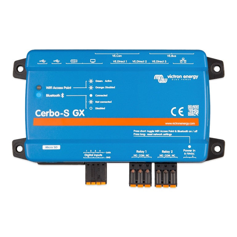 This all-new communication-centre allows you to always have perfect control over your system from wherever you are and maximises its performance. Simply connect through the Victron Remote Management (VRM) portal, or access directly, using the separate GX Touch, a MFD or the VictronConnect App thanks to its added Bluetooth capability. This latest addition to the GX-range combines all the best of connectivity, redefining smart power solutions in every way.