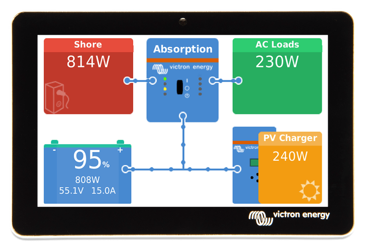 The GX Touch 50 is a companion to the Cerbo GX, the all-new communication-centre allows you to always have perfect control over your system from wherever you are and maximises its performance. Simply connect through our Victron Remote Management (VRM) portal, or access directly, using the GX Touch 50, a MFD or our VictronConnect app thanks to its added Bluetooth capability. This latest addition to the GX-range combines all the best of connectivity, redefining smart power solutions in every way