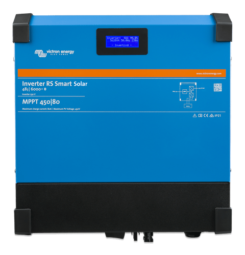 The Inverter RS 48/6000 230V Smart Solar is a combination of a powerful 48VDC, 6kVA 230VAC inverter and a high voltage, 80-450VDC, 4kW MPPT solar charger. Thanks to its modern design and high frequency technology the inverter only weighs 11kg and has an excellent efficiency, low standby power, and very quiet operation.