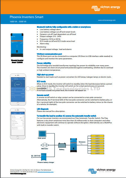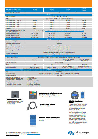The Phoenix Inverter 24/5000 Smart is an efficient and reliable inverter. Built on our proven and field tested Phoenix Inverter platform, it now comes with a new slimmer design and full metal casting. Models are available in 1600VA, 2000VA and 5000VA for 12,24 or 48V systems.