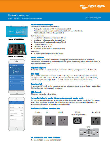 The Phoenix 48/375 VE.Direct inverter allows you to power domestic equipment – requiring 230V – using ‘leisure' or ‘automotive' batteries rated at 12V, 24V or 48V DC.
