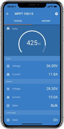 Remotely control and monitor the extensive features of your SmartSolar MPPT charger with built-in Bluetooth by pairing it with your smartphone or other device via VictronConnect. If your installation is connected to the internet with a GX device, the Victron Remote Management Portal (VRM) provides access to the full power of your MPPT, anytime, anywhere; both VictronConnect and VRM are free to use. For remote installations – even when there is no internet connection nearby – you may be able to monitor your MPPT by connecting the GlobalLink 520.